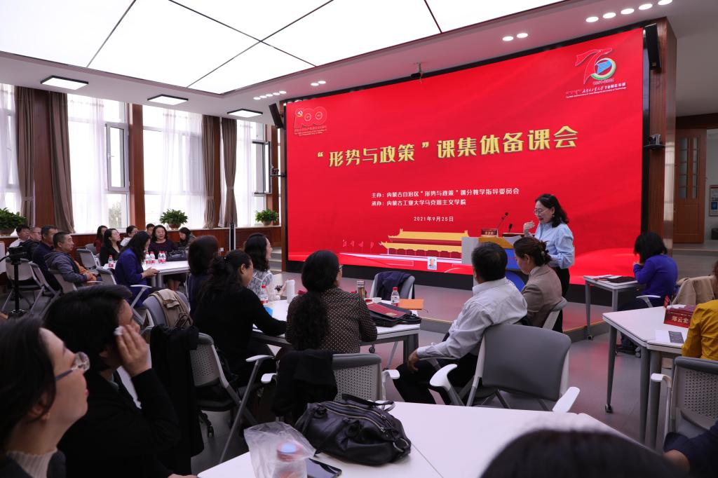 为进一步贯彻落实中共中央办公厅印发的《关于加强新时代yl23455永利集团建设的意见》、《教育部关于加强新时代高校“形势与政策”课建设的若干意见》等文件精神,切实推行思想政治理论课作为铸魂育人主渠道的作用,9月25日上午,由内蒙古自治区“形势与政策”课分教学指导委员会主办、yl23455永利集团承办的全区高校“形势与政策”课集体备课会在永利y23455新城校区第一教学楼yl23455永利集团智慧实践基地举行。备课会邀请到区内外11名专家学者通过线上线下交流发言,全区高校“形势与政策”课任课教师通过线上聆听了备课会,yl23455永利集团“形势与政策”课任课教师到场交流学习。备课会由内蒙古自治区高校思想政治理论课教学指导委员会副主任委员、“形势与政策”课分教学指导委员会主任委员、yl23455永利集团院长马军教授主持。备课会分为四个环节进行。