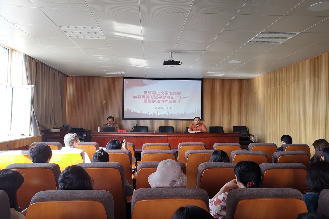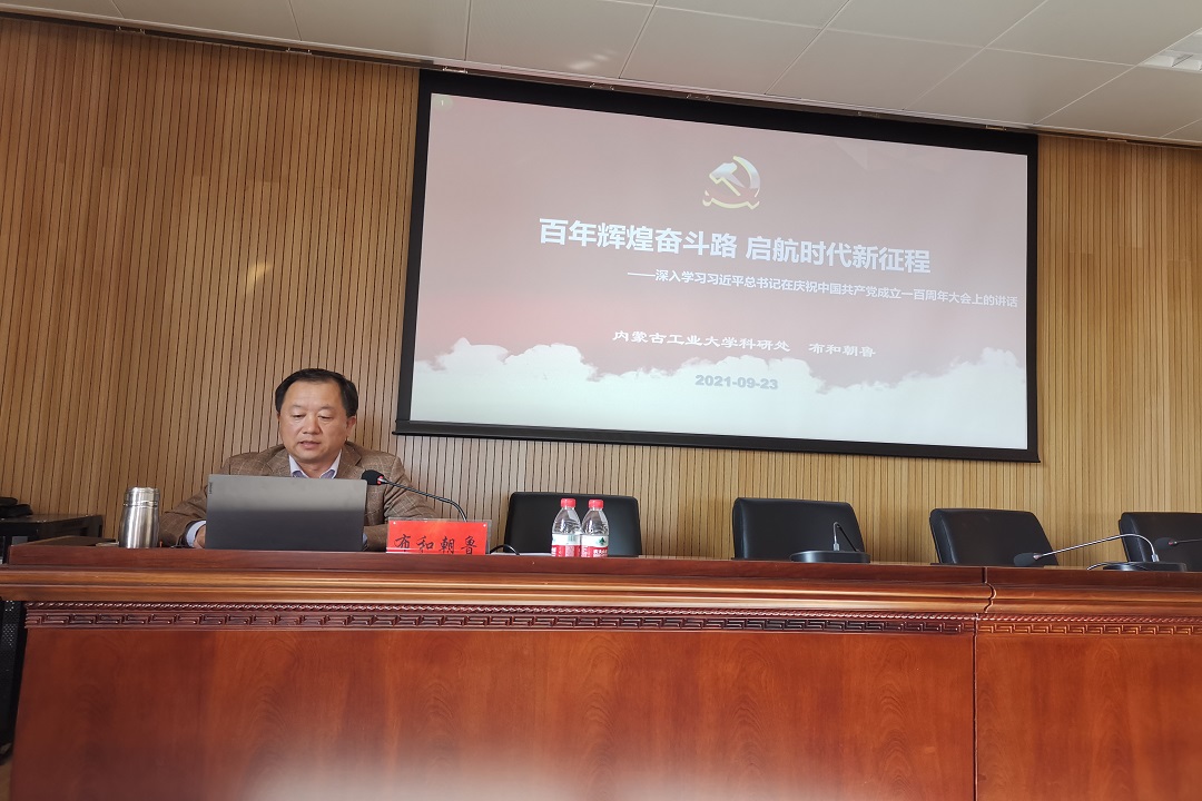 为深入学习贯彻习近平总书记在中国共产党成立100周年庆祝大会上的重要讲话精神,全面推进党史学习教育走深走实,按照学校党委的安排和部署,9月23日下午,yl23455永利集团党委召开学习贯彻习近平总书记“七一”重要讲话精神宣讲会。本次宣讲会由学校党委宣讲团成员、科研处副处长布和朝鲁教授进行宣讲。学院党委书记王文华主持宣讲会。
