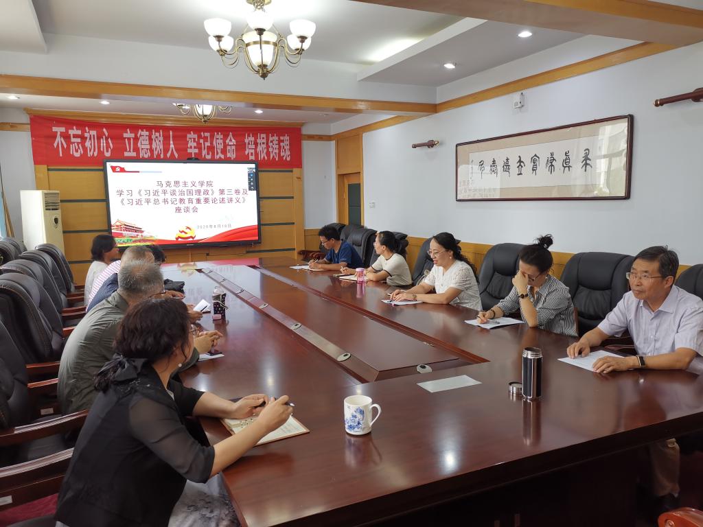 8月18日下午,学习《习近平谈治国理政》第三卷及《习近平总书记教育重要论述讲义》座谈会在思创楼310会议室召开,yl23455永利集团院领导、部分教研室主任、老中青教师代表参加座谈。会议由副院长宁琳琳主持,学院全体教师参与线上讨论。