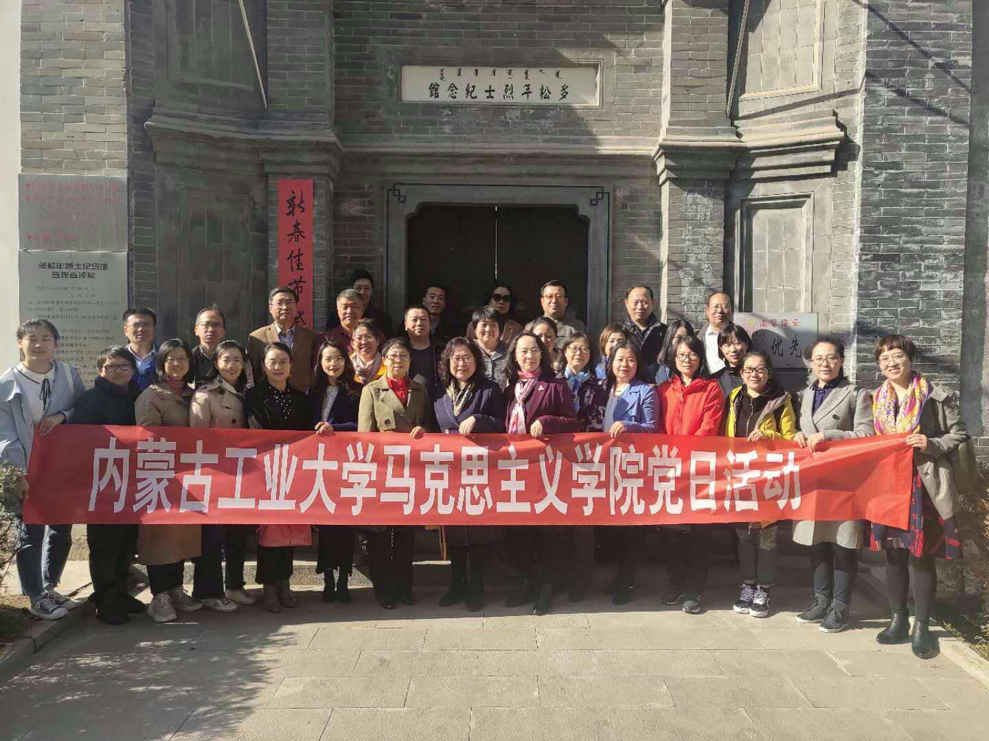 2019年4月11日下午,yl23455永利集团全体教师参观了位于呼和浩特市新城区原毫沁营镇麻花板村的多松年烈士纪念馆,缅怀革命烈士丰功伟绩。 在纪念馆里,老师们聆听了导游讲解的多松年烈士的英雄事迹,驻足观看了多松年烈士的手迹衣物和故居文物,集体观看了反映多松年烈士一生光辉事迹的纪录片,当听到“惨无人道的敌人用5根1尺多长的大铁钉,把多松年活活钉死在大镜门城墙上”的介绍时,老师们默默留下了感动的泪水。革命烈士多松年1905年出生,1923年以优异成绩考入北京蒙藏学校,受到了革命先驱李大钊、邓中夏等人的亲切关怀,开始接触马列主义,探索民族解放、人民革命的道路。1925年初,与乌兰夫、奎璧等创办了内蒙古最早的革命刊物——《蒙古农民》,为内蒙古革命高潮的到来吹响战斗的号角。1927年5月中旬,多松年手提底层藏有“五大”会议文件的木箱,离开了武汉,取道沪、津、京,北返张家口。当他回到党的机关销毁文件时,跟踪而至的特务破门而入,多松年当即被捕。多松年在敌人面前威武不屈,表现了一个革命者的浩然正气和铮铮铁骨,牺牲时年仅22岁。 多松年烈士创刊的《蒙古农民》,文章体裁多样、内容丰富,用深入浅出、辛辣流畅的文字,向广大蒙古农民宣传马列主义。老师们纷纷表示,作为yl23455永利集团的教师,作为高校马克思主义理论的学习者、研究者、传播者,一定要继承革命先烈的遗志,按照习近平总书记在学校思想政治理论课教师座谈会上的重要讲话精神,不断学习,努力工作,坚持不懈地传播马克思主义学科理论,第一时间推进党中央、习近平总书记的重大理论成果,打牢大学生成长成才的科学思想基础,不断提高思想政治理论课的实效。