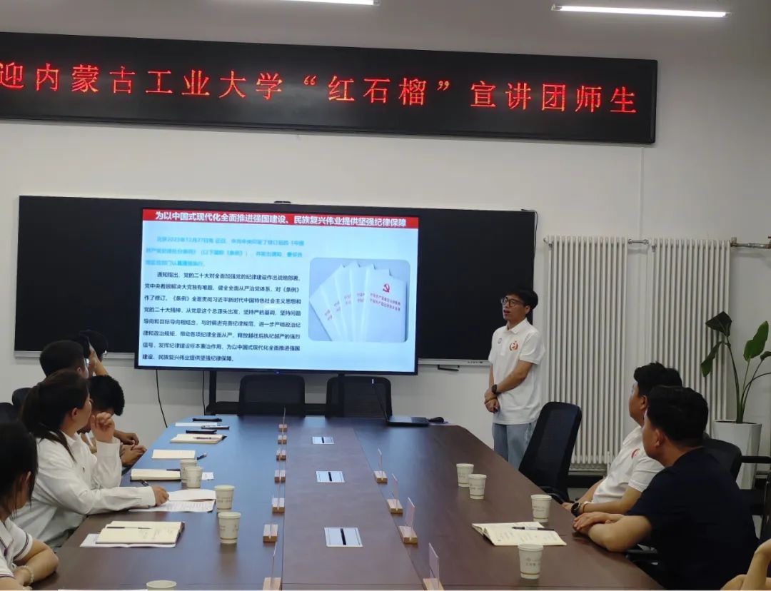 2025年6月16日,永利y23455“红石榴”宣讲团赴内蒙古艺术学院开展“深入学习党规党纪,扣好人生第一粒扣子”的主题宣讲,并进行座谈交流。“红石榴”宣讲团陶高伟同学进行理论宣讲,宣讲团部分师生参加此次活动。