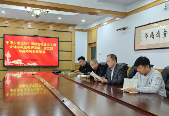 2023年10月11日下午,毛泽东思想和中国特色社会主义理论体系概论教研室教工党支部召开师德师风教育专题学习会。会上,党支部重点学习了《习近平总书记关于弘扬教育家精神的重要指示》《习近平致全国优秀教师代表的信》《中共中央国务院关于全面深化新时代教师队伍建设改革的意见》。通过学习,进一步提高了支部党员对师德师风的认识,增强了师德修养的敏锐性和自觉性,激发了广大教师的职业荣誉感、历史使命感和社会责任感。支部党员纷纷表示,在今后的工作中,要继续严格遵守师德师风要求,发挥党员引领示范作用,以实际行动为学院高质量发展贡献自己的力量。